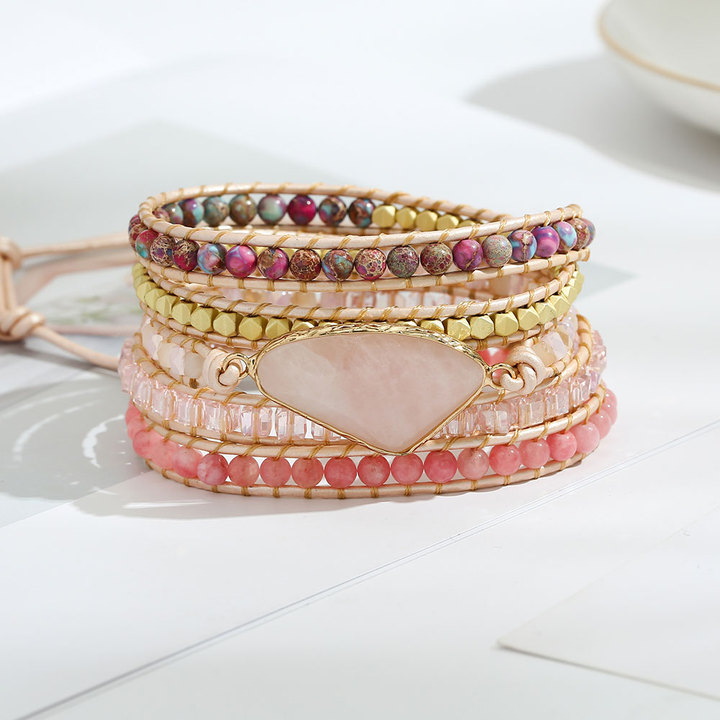 बोहेमिया 5 Wraps गुलाब क्वार्ट्ज प्राकृतिक पत्थर कंगन हस्तनिर्मित बहुपरत मनके समायोज्य आभूषण महिलाओं और लड़कियों के लिए